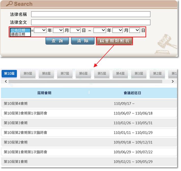 可限定公布日期或通過日期範圍,並提供會期日期對照表連結進行查詢。