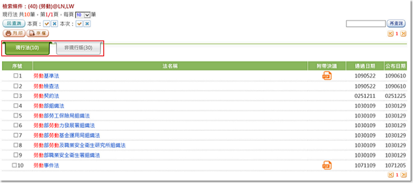查詢結果以簡目顯示,可點選法律狀態頁籤進行切換。