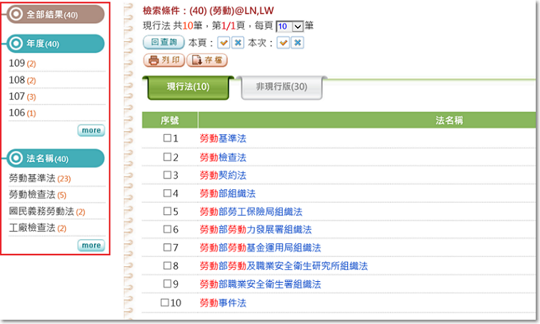 針對現行及沿革法律資料進行法律名稱、全文檢索。
