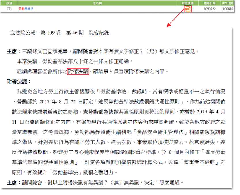 法律若有附帶決議,點選「附帶決議」欄內