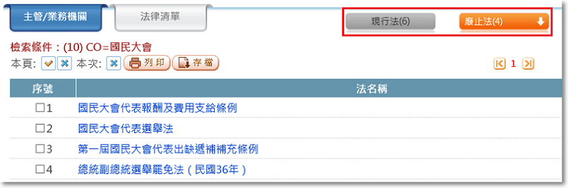 顯示所有法律清單,可點選法律狀態頁籤進行切換。