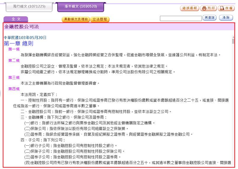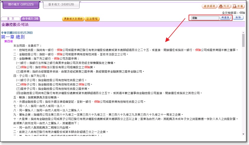 可針對條文內容作縮小範圍的再查詢,並顯示命中條文。