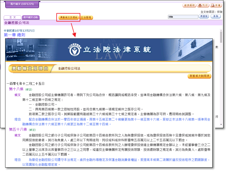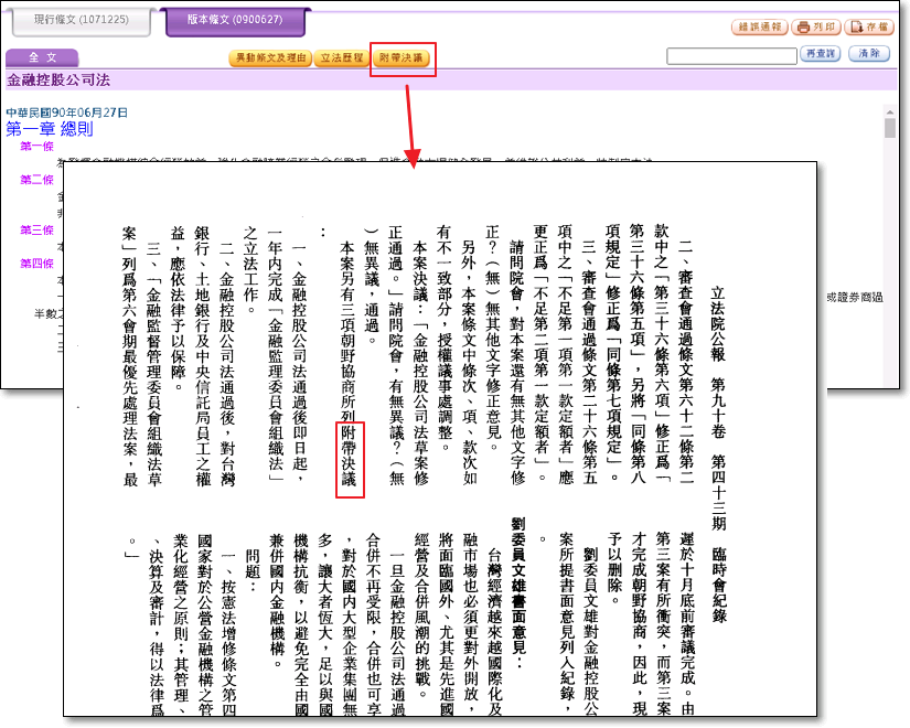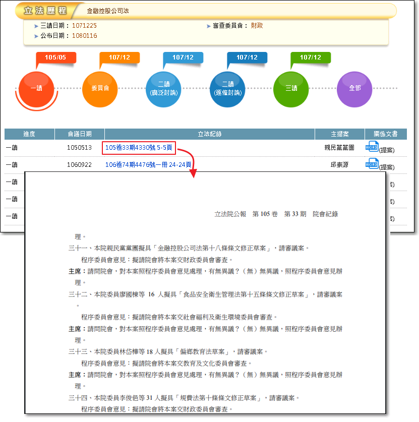 點選「立法紀錄」欄位,另開顯示相關立法院公報影像。