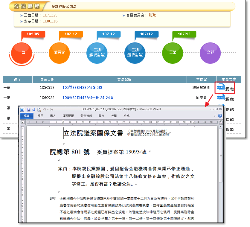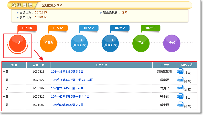 點選審議進度圖示,下方表格會切換顯示對照資訊。