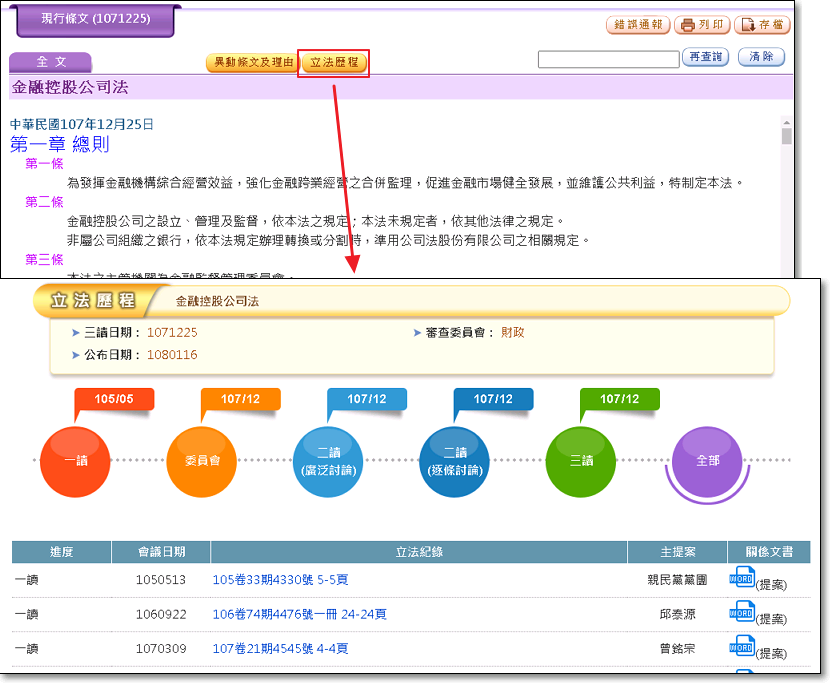 另開顯示審議過程,包含公布日期、施行日期等相關資訊。