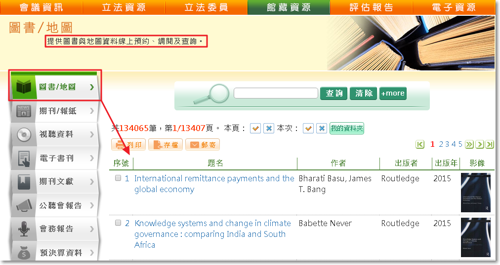 - 圖書/地圖、期刊、視聽資料可點選右側影像,開啟書目資訊。